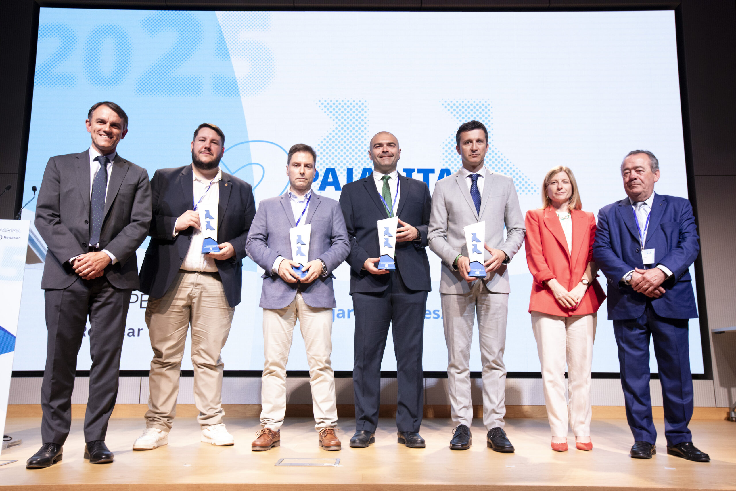 En la foto, todos ellos con D. Jordi Aguiló, presidente de ASPAPEL; Dña. Marta Gómez Palenque, directora general de Calidad y Evaluación Ambiental del Ministerio para la Transición Ecológica y el Reto Demográfico; y D. Manuel Fernández, presidente de REPACAR.