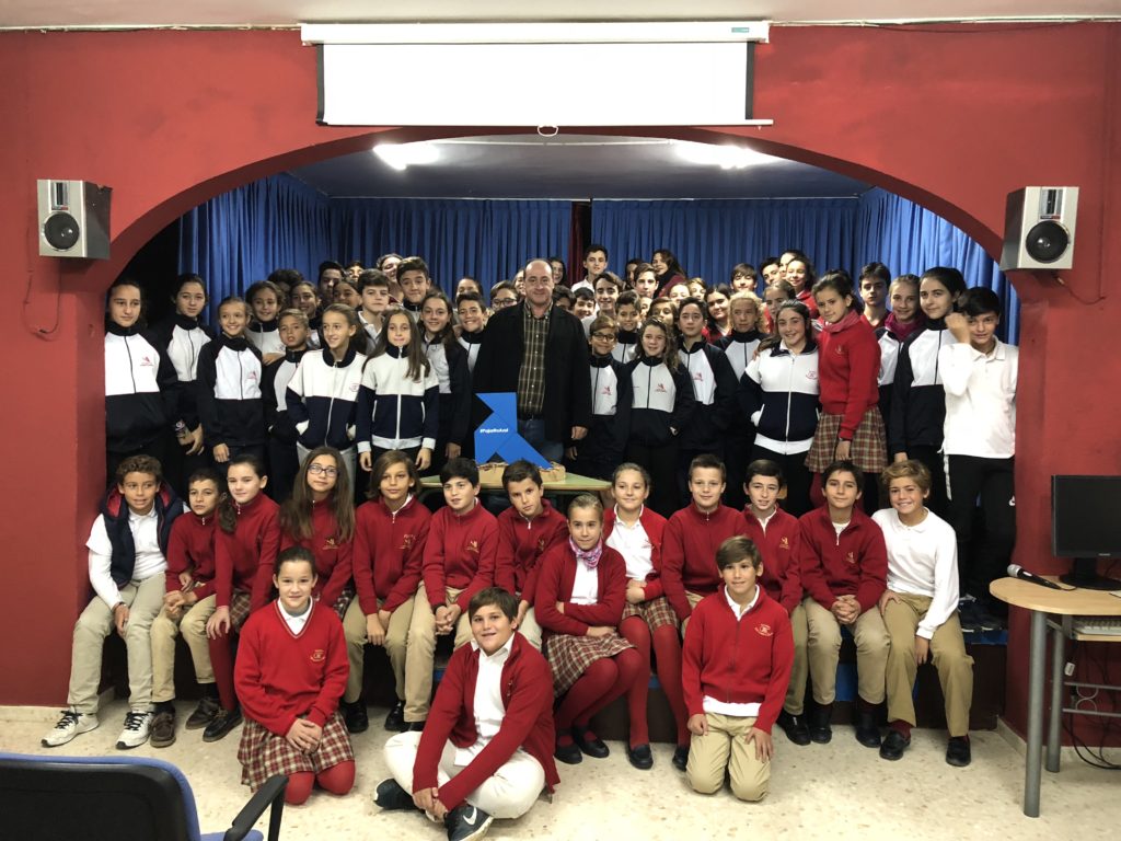 Con la directora, los alumnos y profesores del IES San Alberto Magno de Montequinto, Ecoescuela en la que se realizó una charla-coloquio.